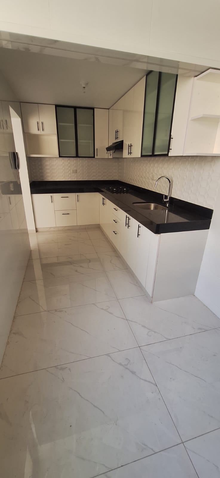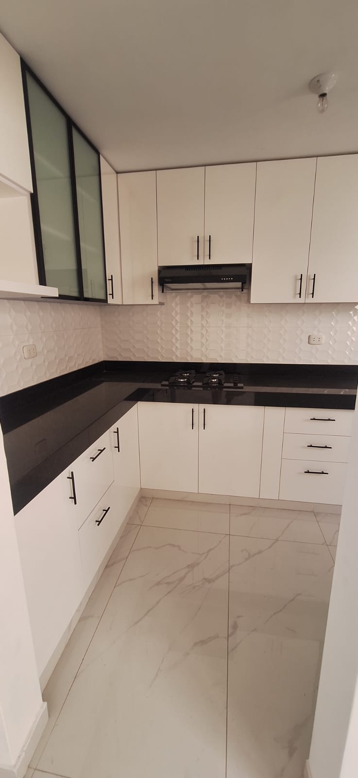Cocina con tablero de cuarzo, encimera y campana